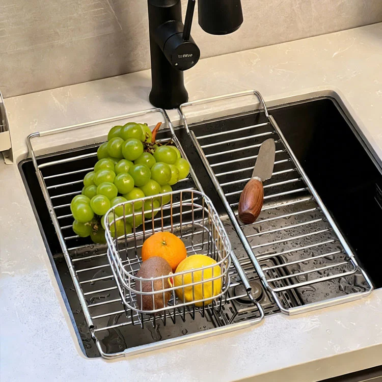 Оваа растеглива багажник за мијалник од не'рѓосувачки челик е често користен хардвер за складирање и одвод во кујната, специјално дизајниран за одводнување и привремено складирање на приборот и состојките во областа на водниот слив. Со својата прилагодлива големина, материјалот од нерѓосувачки челик и практичната структура, тој стана основна алатка за складирање во областа на кујнскиот воден слив.