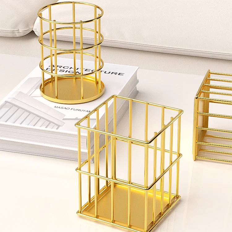 1. Нашиот издржлив метален држач за пенкало за канцелариско биро прифаќа рационализиран дизајн од цилиндрични и квадратни форми, кој е едноставен и извонреден. Процесот на галванизација му дава елегантен сјај. Стилот на работната површина е уникатен во споредба со другите. Процесот на премачкување во прав нуди повеќе опции за боја, задоволувајќи ги потребите на различни преференции.